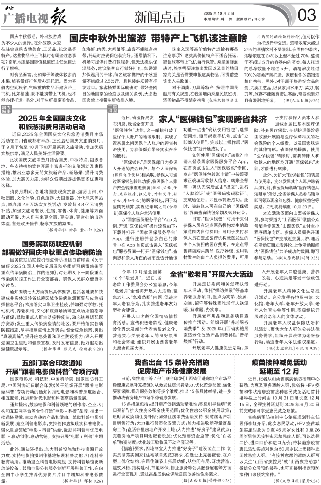 国庆中秋假期,外出旅逛成为不少人的选择。正在外旅逛,大师往往会选购本地美食、工艺品、留念品等特产。这些物品带上飞机时有哪些留意事项?南航地服部国际值机值班从任赵臣进行领会答。对食物而言,好比椰子等液体较多的生果,搭客最好打包后打点托运。由于客舱内空间狭小,气息沉的物品不带上飞机,好比榴莲,既不克不及照顾上飞机,也不克不及打点托运。别的,对于生鲜易腐类食物,如海鲜、肉类、大闸蟹等,搭客不克不及随身照顾,托运时应确保包拆无缺。凡是环境下,机场可供给付费打包揽事,但无法供给保温办事,搭客自行做好打包,如需添加保温用的干冰,每名搭客照顾的干冰分量不克不及跨越2。5公斤,且包拆必需带有挥口。搭客搭乘国际航班时,最好查阅目标地国度的检疫以及海关条例,大大都国度照顾生鲜物品入境。珠宝文玩等高价值特产运输有哪些留意事项?这类高价值特产不适合托运,搭客带上飞机自行保管。乘坐国际航班时,搭客需要留意出发国以及目标地国度海关能否需要申报这类物品,可提前查询收支关政策。对于酒类、刀具等特产,按照中国平易近航局相关,正在我国境内乘坐平易近航班机,酒类物品不得随身照顾(正在候机楼隔离区内采办的酒精饮料除外),但能够做为托运转李交运。酒精浓度未跨越24%的酒精饮料不受。正在零售包拆内,酒精浓度正在24%以上但不跨越70%,盛拆于不跨越5升的容器内的酒类,每人托运的总净数量不跨越5升。酒精浓度跨越70%的酒类严禁托运,家庭制做的蒸馏酒照顾。别的,对于属于旅逛留念品的剑、刀类工艺品,以及家用生果刀、菜刀、餐刀等,搭客不克不及随身带进客舱,需要包拆好且有地托运。近日,2025年全国国庆文化和旅逛消费月从场勾当正在四川省成都会举办,正式启动国庆文旅消费月,于9月下旬至10月下旬开展系列文旅勾当,添加优良文旅供给,满脚人平易近夸姣糊口需要。此次国庆文旅消费月连系国庆、中秋特点,组织各地、各支撑机构筹谋开展丰硕多样的文旅勾当及惠平易近办法,推出业态多元的文旅新产物、新场景,提拔消费体验,加大惠平易近力度,为群众假期出逛供给更多优惠和选择。消费月期间,各地将环绕不雅演赏剧、逛历江山、中秋团聚、文化体验、红色旅逛、大国沉器、时代风度等热点,举办超2。9万场次文旅勾当,发放超4。8亿元消费补助,加强文旅取餐饮、住宿、零售、体育、健康等方面联动互促,为人们带来更全面、更实惠、更省心的出逛体验,营制欢庆佳节、畅享文旅的空气。国务院联防联控机制疫情防控组日前印发《关于做好2025年国庆中秋前后及秋冬季新冠病毒传染等沉点流行症防治工做的通知》,对近期及下一阶段沉点流行症防控工做进行全面摆设,确保人平易近群众健康安然过节。通知环绕七风雅面提出具体要求,包罗各地要加速建成并实体运转省统筹区域流行症监测预警取应急批示消息平台;依法落实港口卫生检疫,并加强对学校、托长机构、养老机构、文化和旅逛场合等沉点场合的指点取督促;激励沉点人群自动接种疫苗,动态统筹调配医疗资本;发生严沉流行症疫情的地域,要严酷落实各项防控办法,尽早节制疫情上升势头;健全应急预案,凸起“实演实练”,提拔应急措置和卫生防疫能力;深切开展爱国卫糊口动和健康宣教,及时发布消息,做好假期出逛健康提醒等。国度片子局、科技部、中国科学院、国度国防科工局、中国科协近日结合印发《关于组织开展“跟着片子做科普”专项步履的通知》,鞭策片子和科普深度融合、彼此赋能,推进新时代片子和科普高质量成长。通知提出,激励片子和科普范畴的创做者、企业、机构和互联网平台等合做打制“片子+科普”品牌,推出一批通俗易懂、活泼风趣的产物和勾当。激励科普片子立异成长,成立科普片子库,支撑创做虚拟现实科普片子。强化沉点范畴“片子+科普”供给,激励将科普取优良片子IP联动创做、联动营销。支撑开展“片子+科普”从题勾当。此外,通知还提出,加大科普设备和科技资本力度,支撑片子拍摄制做拓展科普功能,打制科育场合。鞭策成立科普片子院线,支撑科普场馆更新放映设备。激励片子公共办事立异开展科普工做,正在向全国中小学生保举优良影片片目中添加科普片子数量。近日,省医保局发布动静,我省全面开通“医保钱包”功能,这一行动打破了医保小我账户的地区,实现了近亲属之间医保小我账户的跨省共济利用,为参保群众带来实实正在正在的便当。“医保钱包”是医保部分为参保人开通的资金账户,取小我医保码(医保电子凭证)相联系关系。参保人可通过医保钱包转账功能,将医保小我账户资金转账至近亲属(配头、父母、后代、兄弟姐妹、祖父母、外祖父母、孙后代、外孙后代)的医保钱包,用于就医购药结算,实现近亲属之间(含跨省)医保小我账户共济利用。以“国度医保办事平台”App为例,开通“医保钱包”操做流程如下:下载并打开“国度医保办事平台”App,进行注册并登录本人的账号→正在App首页点击进入“医保钱包”办事界面→打开“医保钱包”,查询您和亲人所正在的城市能否开通该功能→点击“确认利用钱包”,选择利用地,填写绑定手机号,点击“当即确认利用”。完成以上操做后,“医保钱包”就开通成功了。若何利用“医保钱包”转账?申请人登录国度医保