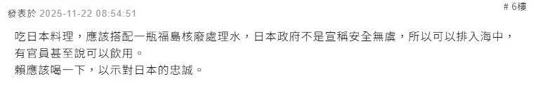 11月20日,中国地域带领人赖清德正在多个社媒平台发布吃寿司和味增汤的图频,并标注食材来自日本。他写道:“若是你还正在想晚餐要吃什么,也许今天,就是适合吃点日本料理的时候。”21日,台卫生福利部分颁布发表,本日起全面解禁对日本食物的进口。同日,台外事部分担任人吴钊燮还特地正在X平台发布日本推文,向日本示好。面临“取当前风浪无关,只是方才好”的说辞,岛内暗示,信你个鬼。值得一提的是,自2011年福岛核变乱后,地域对日本食物进行了长达14年的进口审查和。分析“结合旧事网”“中时旧事网”等台媒报道,此番操做,遭到岛内普遍质疑。多名代表和人称,赖正在机会搞工作,实属将算计于权益之上,弃渔平易近好处于掉臂。网平易近则留言称,赖“卖台”“媚日”,令人曲呼“恶心”。
